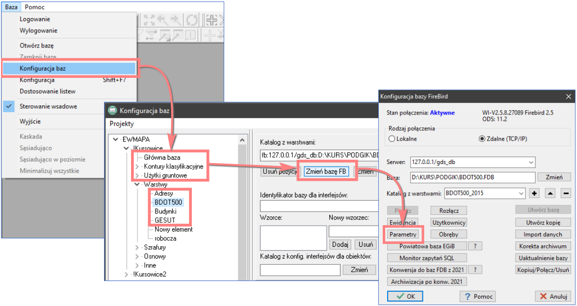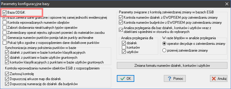 W przypadku baz wykorzystywanych w starostwach powiatowych parametr ten powinien zostać bezwzględnie włączony dla wszystkich baz EGiB, BDOT500 oraz GESUT. Obecnie ustawienie to ma zastosowanie wyłącznie w kontekście bazy EGiB, jednak w przyszłości nie wyklucza się jego szerszego wykorzystania w innych obszarach programu. W związku z tym rekomendujemy włączenie tej opcji we wszystkich bazach, aby zapewnić spójność konfiguracji oraz uniknąć konieczności późniejszych zmian.Gdzie znajduje się okno parametrów konfiguracyjnych bazy? - Do operatów dodano nowe pole Zmiana EGiB tylko dla części geometrycznej.