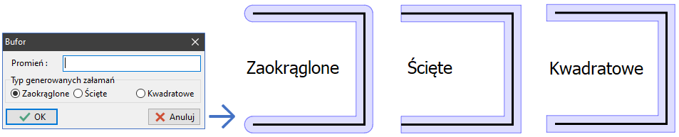Obie funkcje działają według nowego mechanizmu wyznaczania powierzchni.- Bufor markera polilinii - dodano wybór typu załamań: zaokrąglone (jak dotychczas), ścięte, kwadratowe.